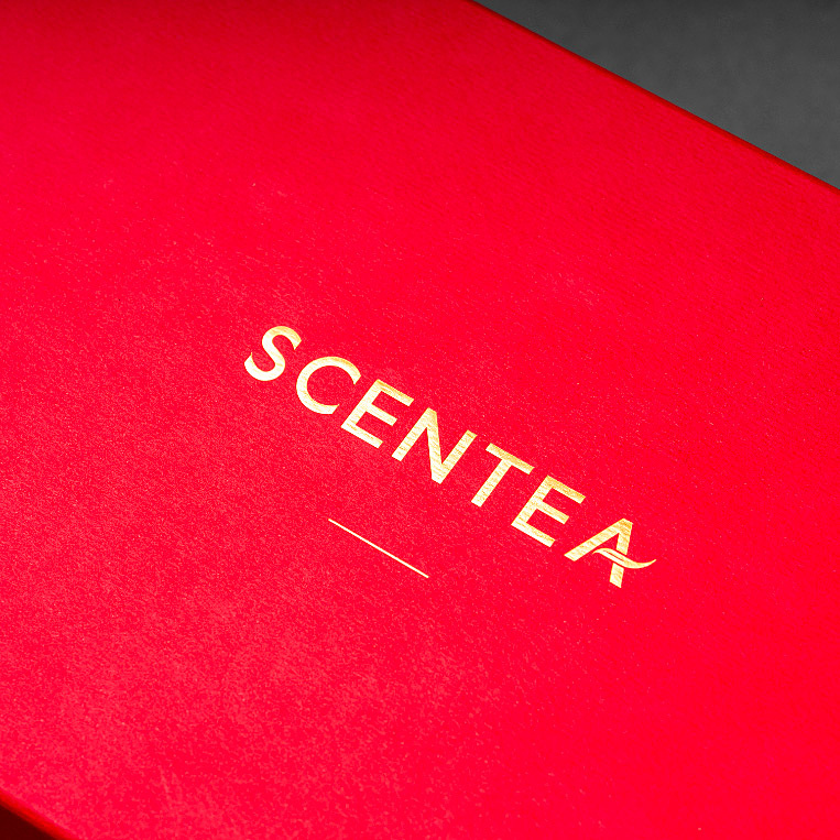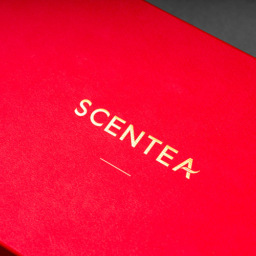 SCENTEA 軒汀禮盒採全手工方式製作,手工盒外以洋紅色日本進口美術紙貼合包覆,盒內以淡雅灰美術紙作為襯紙,從上下盒中露出更顯細膩。新春禮盒上方與提袋以香檳金燙印,更顯別緻,也更添福氣。不論是長輩或客戶贈禮都相當適宜。